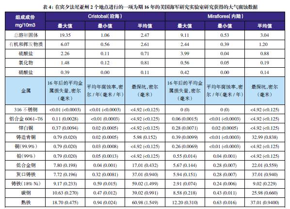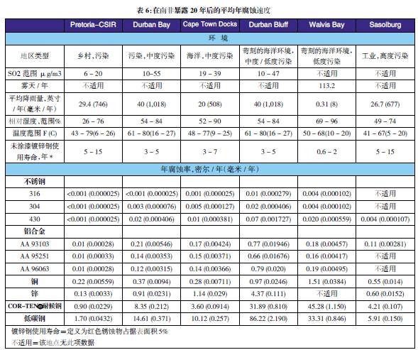 表3至表6的數據來自于日本、巴拿馬、Kure 海灘(北卡萊羅納州)和南非的試驗地點。可利用這些數據在類似環境中選擇適當的金屬材料,進行生命周期成本分析。